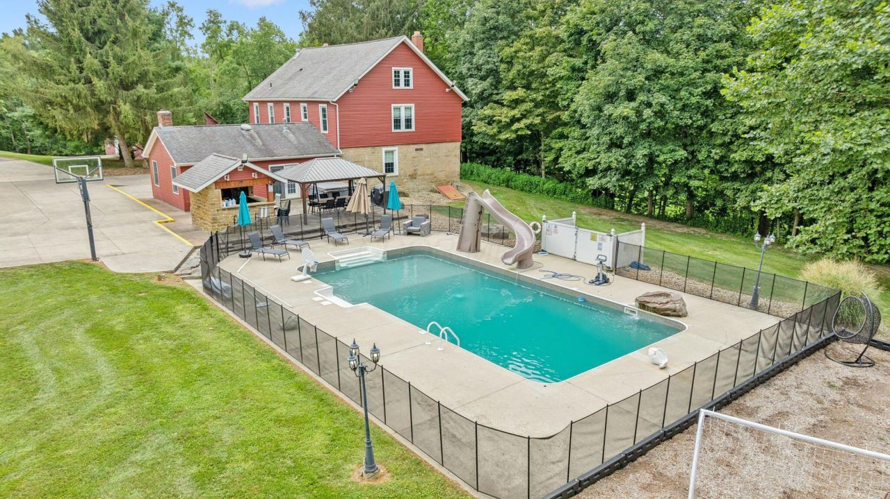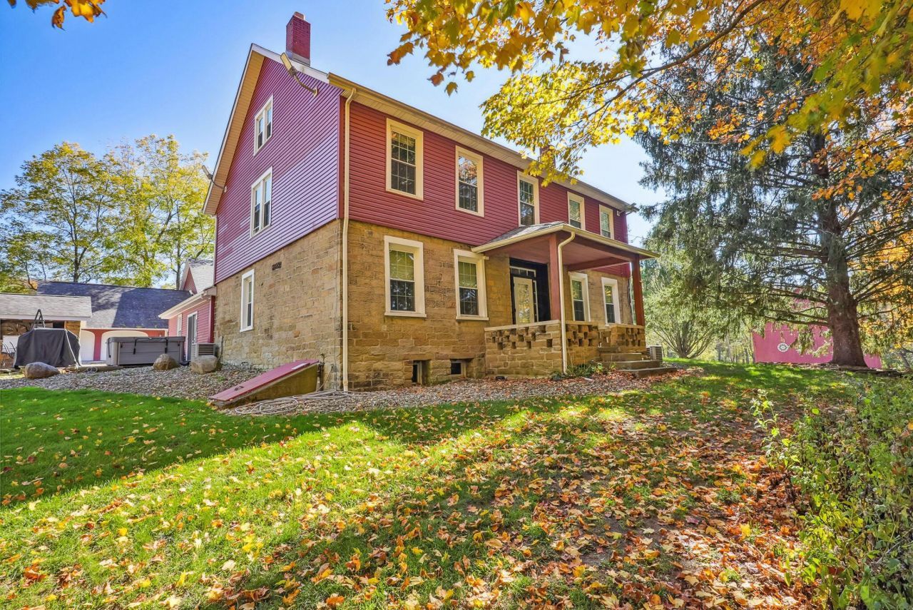 Private Licking county estate with over 7 acres sits above Quarry Run. The large circa 1805 farmhouse is 3,000 sqft, 4 bedrooms, 2-1/2 baths, with historic finishes exposed stone, wood floors and 3 fireplaces. An open kitchen and lots of entertaining space inside and out. Multiple outbuildings with potential to add more finish space in the heated 2500 sqft FIVE car garage. The oversized garage currently serves as an indoor rec area for pickle ball. Resort like exterior has pool and stone bar. The large timber-framed bank barn adds to the historic landscape of the estate. This private setting creates a perfect home, retreat, Bed & Breakfast, wedding venue or investment with Airbnb income.